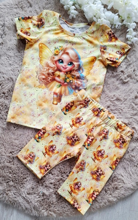 Zestaw Bluzka Arta krótki rękaw z falbana prostokątną z leginsami prostymi.